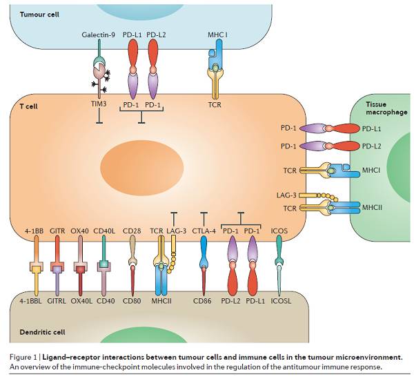 免疫检查点阻断疗法发挥抗癌作用是通过激活抗肿瘤免疫反应。其中,T细胞在对抗癌症的免疫防御机制中扮演着重要角色:它们识别肿瘤抗原,然后被激活、传播,最终消灭癌细胞。事实上,T细胞的激活受T细胞、树突状细胞、肿瘤细胞和肿瘤微环境(TME)中巨噬细胞上配体-受体(ligand– receptor)相互作用的调节。这些受体-配体对(receptor–ligand pairs)被称为免疫检查点。图1汇总了参与调节抗肿瘤免疫反应的免疫检查点分子。