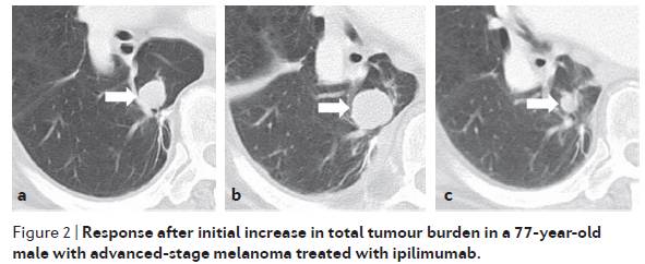 由于免疫检查点抑制疗法引发了独特的抗肿瘤机制,因此,使用这类药物的患者可能会产生传统的肿瘤响应标准(tumour-response criteria,如WHO标准、实体瘤响应评估标准(RECIST))中没有包含的肿瘤响应模式。举例来说,在用免疫检查点抑制剂治疗的一小部分患者中,响应可能在肿瘤负担初始增长后(after an initial increase in tumour burden,图2)或者新病变出现时或出现后(during or after the appearance of new lesions,图3)才被检测到。根据WHO标准和RECIST,这些事件将被归类为肿瘤进展,也被称为“假性进展”(pseudoprogression)。在假性进展的情况下,成像所检测到的肿瘤体积的增加被认为是T细胞浸润(免疫激活的结果)导致的,而不是由肿瘤细胞增殖引起的。