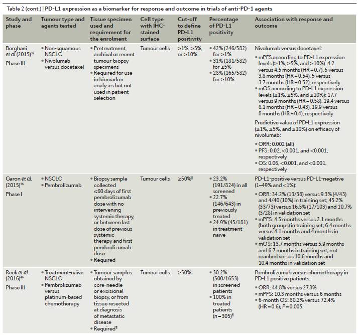 将肿瘤细胞上PD-L1的表达水平作为免疫检查点抑制疗法的潜在生物标志物的研究在这类疗法发展的早期就已经开始了。下表是作者们汇总的一些相关临床试验结果。该部分内容讨论了将PD-L1作为生物标志物的合理性以及存在的一些问题。