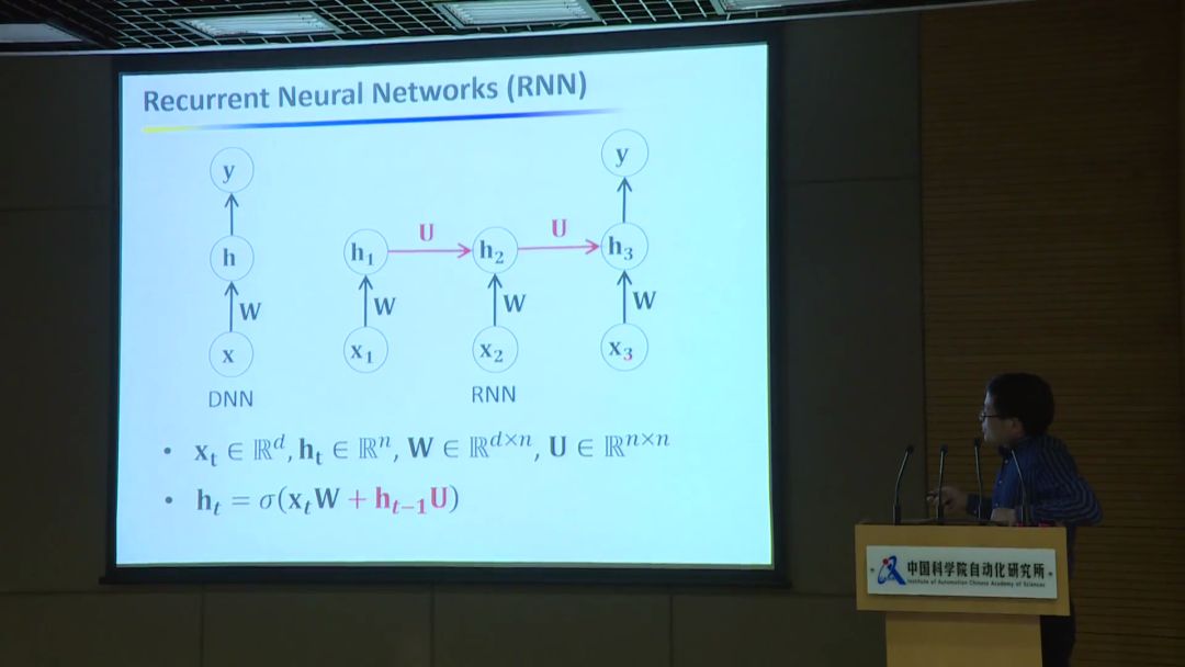另外一个重要的模型就是RNN。左图展示一个三层的网络,x是输入层,h是隐含层,y是输出层,这是典型的三层的DNN网络。DNN通常用来处理静态数据,比如图像,但却不能很好地对时序关系建模,这就需要用到RNN。RNN是把序列数据,比如x1、x2、x3,作为网络输入并建模,最后得到输出y。在这个过程中,每个时刻的输入都对应着一个隐含层的表示,而相邻的隐含层之间又进行了一个连接操作。RNN可以看成是DNN沿着时间轴的扩展,它使用了额外的权重矩阵U,来对长距离的时间相关关系进行建模。