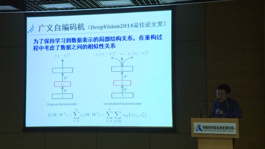 广义自编码机,CVPR-DeepVision2014最佳论文奖的工作。传统的Autoencoder的目标是最小化其本身和重构结果之间的误差。为了能够学习数据的局部结构关系,我们在重构过程中考虑了数据之间的相似性。在优化中,不仅是利用输入数据重构其自身,还要重构其周围相关数据点。