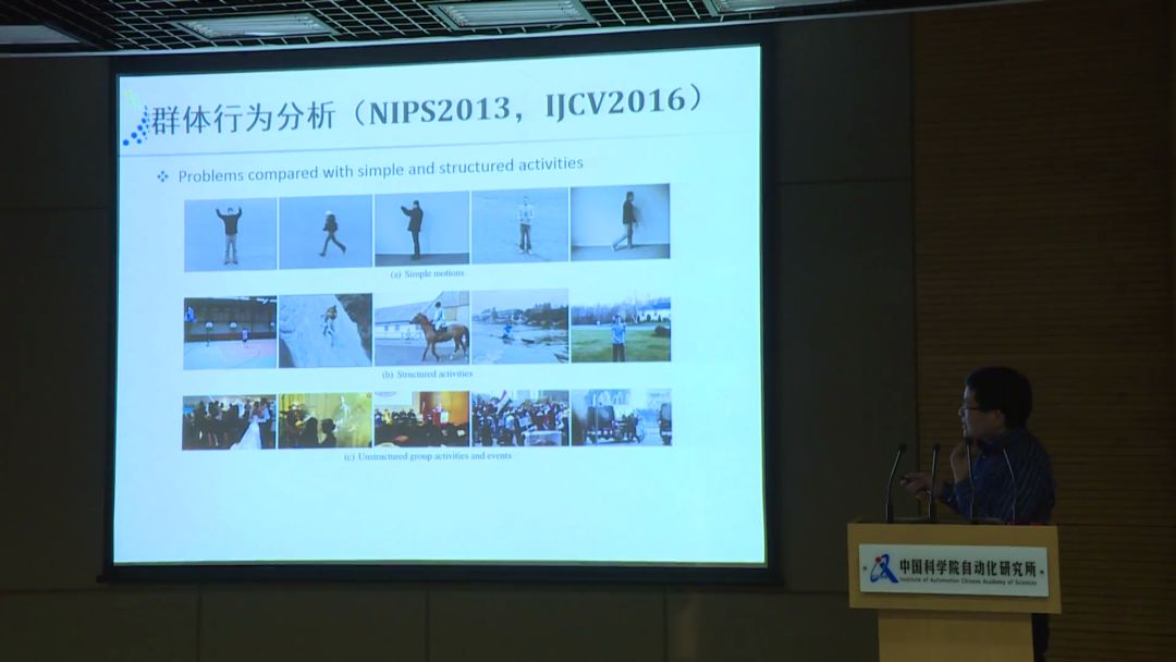 群体行为分析,是NIPS2013年和IJCV2016年的工作。行为分析从复杂度上划分,开始是简单的个体行为,后来做结构化的行为(如骑马),也包括一些群体行为识别(如结婚典礼、毕业典礼)。为了对复杂行为进行识别,我们提出类相关RBM模型。这个模型由两块组成:一部分提出视频的低层语义特征输入到模型来学习视频的中层表达特征;另一部分基于视频的语义标签,利用模型自动关联相应知识,进而来指导学习过程。