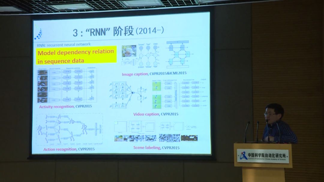 前两个阶段都没有或很少考虑对序列数据建模,特别是对序列数据中的时间关系建模。递归神经网络(RNN)是序列化模型,其隐含层不仅接受当前时刻数据层的输入,同时也接受前一时刻隐含层的输入,因此RNN能够更好地解决时间关系建模问题。RNN随后在计算机视觉的各个任务都得到广泛应用,例如用于预测一段文字来表述图像内容。