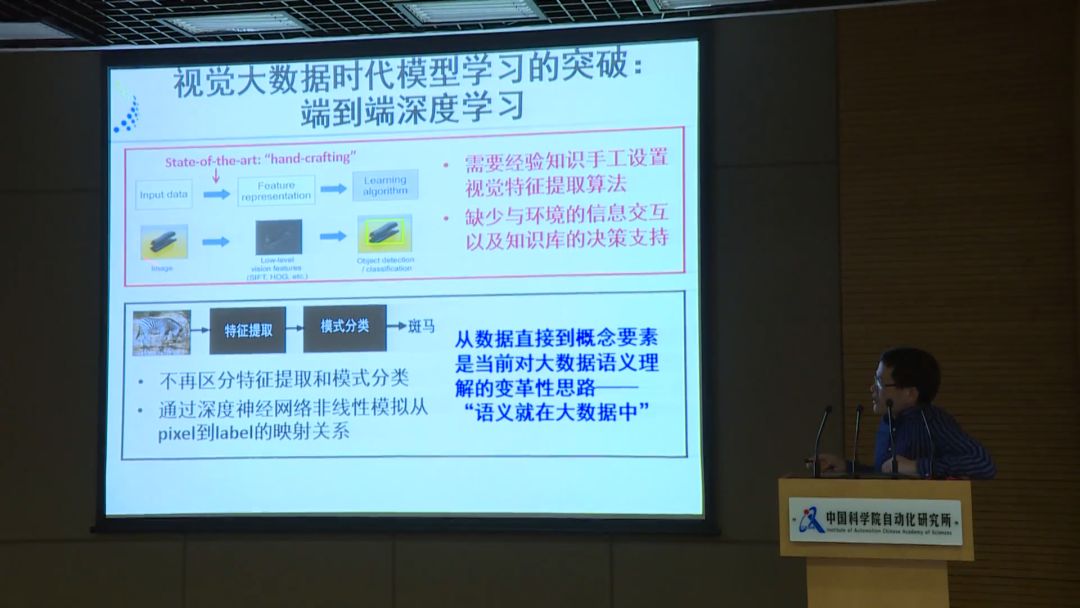 深度学习可以解决端到端的模式识别问题,给定一个图像,经过“黑匣子”的学习,最终输出预测结果斑马。在这个端到端的识别的过程中,不加以区分地把特征提取和模型学习融为一体。通过深度神经网络来模拟从像素输入到“斑马”标签的非线性映射,即直接从原始数据到语义概念,这是对视觉大数据语义理解的变革性思路。