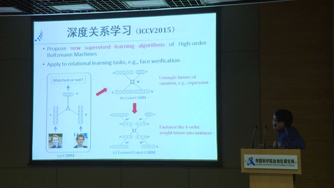 深度关系学习,是ICCV2015的工作。在传统的Boltzmann Machines中引入了关系的类别标签Z,并且提出了条件高阶玻尔兹曼机(CHBM)。在这个过程中,x、y是两个输入,他们之间的关系用Z表示。两者之间的关系可能受隐含因素h的影响,如人脸匹配可能受到光照、视角或者表情的影响,因此h就可以学习到光照影响的可能关系。这样的模型怎么学习?因为它所包含的权重W是四阶张量,可以把四阶张量分解到矩阵的方式来简化求解。