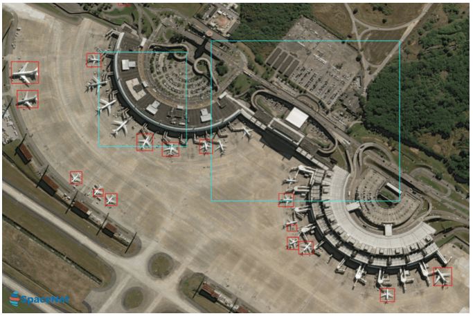 这一通用模型产生了较差的结果。检测到的飞机被红框圈起来,可以看到还有几架被遗漏。另外蓝框内是被模型误解的“跑道”