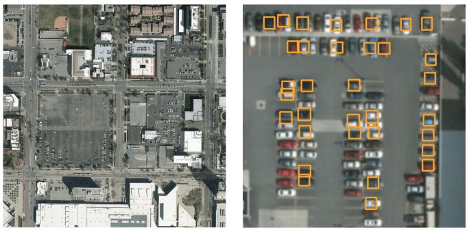 空中成像的目标物体检测对标准网络架构的挑战。两张图片来自统一数据集。左图中的模型将4000×4000像素的测试图像降采样到416×416,图中共有1142辆车,没有一辆被识别出来。右图中的模型同样是416×416,漏报率过多是由于车辆密度太大,13×13的网格无法将它们分辨出来
