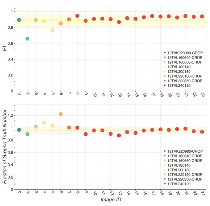 接着,我们在COWC数据集上测试了YOLT对汽车的检测结果,下图是在每个场景中模型的F1分数以及对汽车数量计算的精确度: