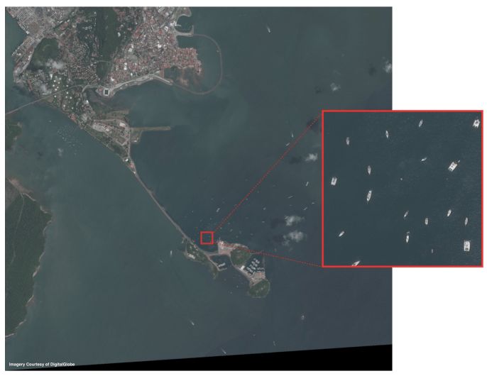 DigitalGlobe在巴拿马运河附近拍摄的8×8km(约16000×16000像素)的图像,GSD为50cm。红框表示416×416像素大小的区域