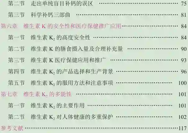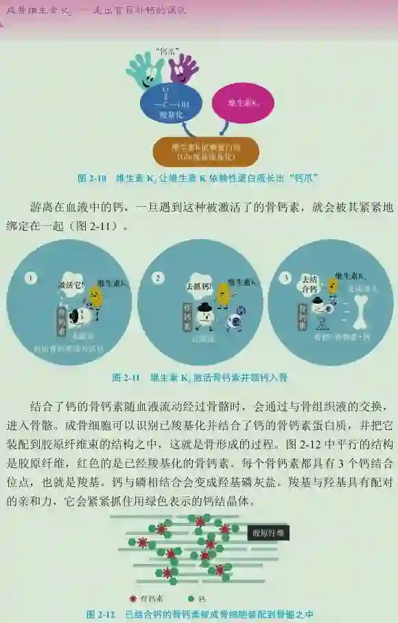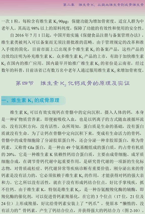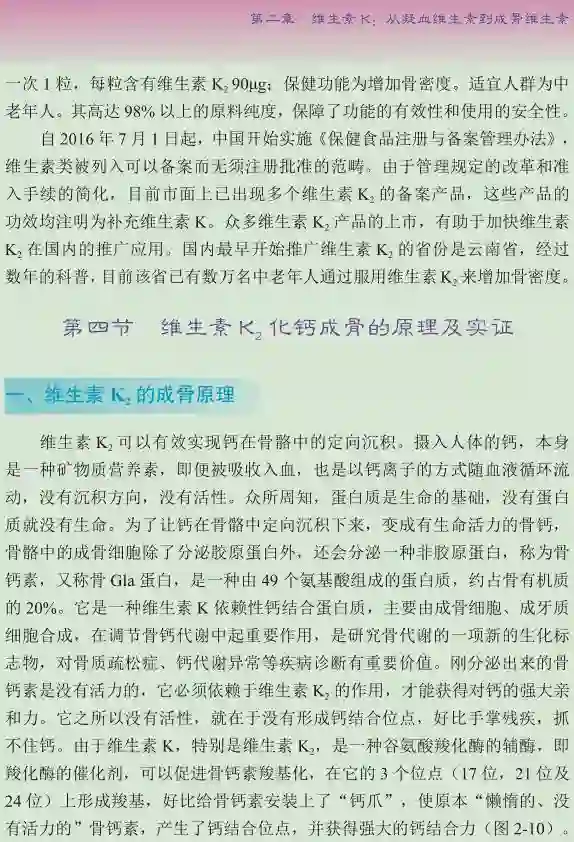 如今,八十多年过去了,众多科学家经过艰苦探索和不懈努力,发现维生素 K 家族中的维生素 K2具有化钙成骨的作用。从胎儿的骨骼发育、少年儿童的骨骼成长到孕妇及哺乳期妇女的防止骨钙流失,特别是中老年延缓、抵抗甚至逆转骨质疏松方面,维生素 K2都在发挥着关键性的作用。所以,维生素K2无疑是一种“成骨维生素”。这一新的重大发现,颠覆了单纯补钙即可补骨的传统观念,揭示了“补钙≠补骨”的新观念。不仅如此,科学界还发现,维生素 K2在人体钙代谢的过程中,起着“决定钙走向”的作用,它引导被摄入体内、进入血液中的钙离子沉积到人体的骨骼牙齿之中,抑制钙离子沉积到血管、软骨(关节及椎间盘)、肾脏、肝脏、皮肤甚至眼底中。维生素 K2甚至能够将已经钙化和硬化的血管、软骨等组织重新软化,不仅能消除钙斑和硬化斑,而且可以把渗入软组织的钙离子重新“抽提”出来。动物实验和人体临床研究已经证明,维生素 K2一方面可以防治骨质疏松,使硬骨骼更加健康;另一方面,可以保护软骨、血管,对关节病(如颈椎病、腰椎病)并且对心脑血管疾病的预防保健和辅助治疗也卓有成效。正因为如此,科学界认为,维生素 K2是一种重要的、人体必需的维生素,它对人体健康具有基础性的作用,其贡献是巨大的和十分突出的。
