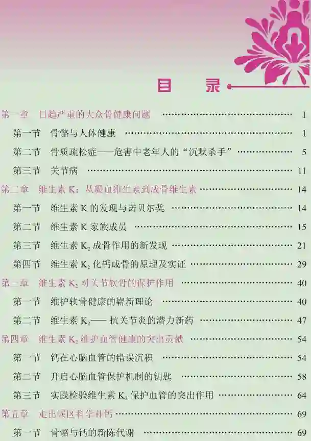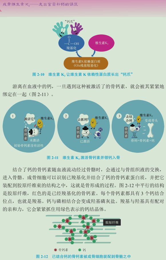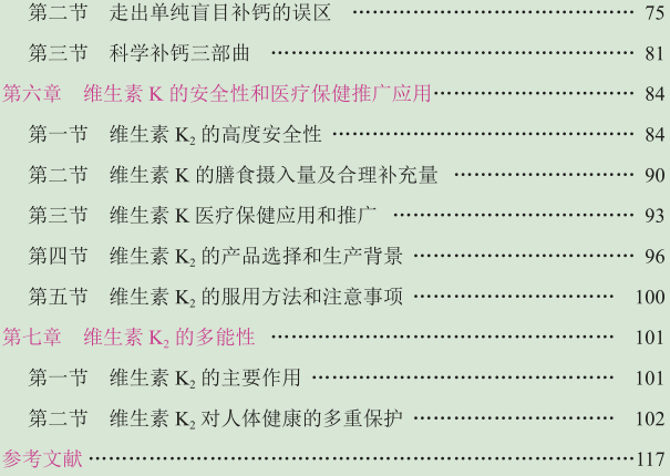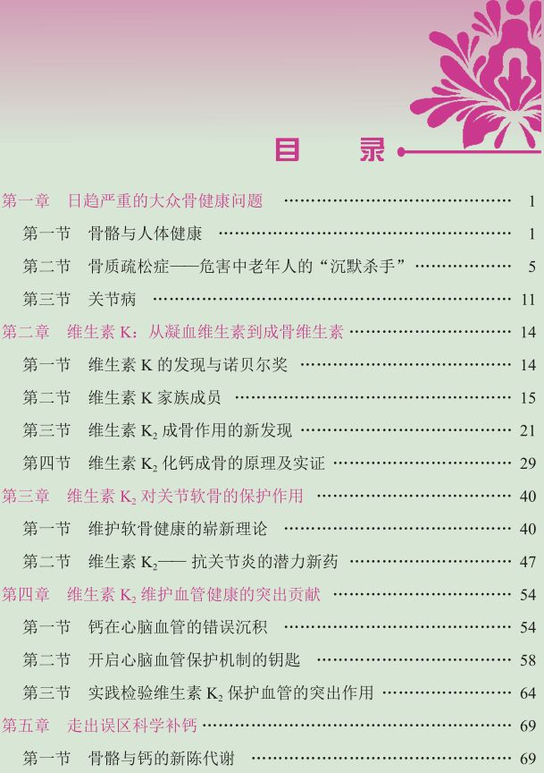 《成骨维生素 K2:走出盲目补钙的误区》较系统地介绍了维生素 K 家族中维生素 K2的成骨机制及其在防治骨质疏松、关节病及心脑血管疾病方面新发现的突出作用,论述了传统的盲目补钙会导致钙的异位沉积而损害健康的问题,以及维生素 K2 领钙入骨、化钙成骨的功效,同时对维生素 K2的多能性,即在抗癌、保肝、护肾、降糖、改善阿尔茨海默病、抗帕金森病方面的作用也做了介绍。