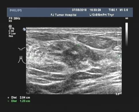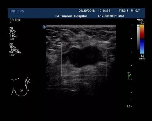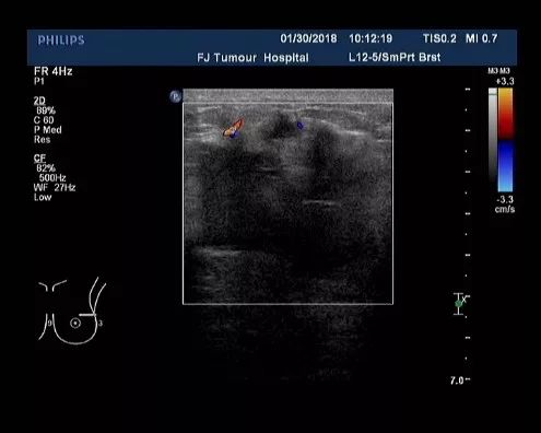 ▎疗效评估:B超(2018-07):左乳2-3点处探及一低回声区,大小约2.2cm×1.4cm,边缘不规则,可见成角、毛刺,内部回声不均;左腋中、下组探及数个低回声,大者约1.6cm×0.7cm(腋中组)、0.9cm×0.5cm(腋下组),边界尚清,类圆形,皮髓质分界不清,皮质不规则增厚,淋巴结门消失,右乳及右腋窝未见异常。