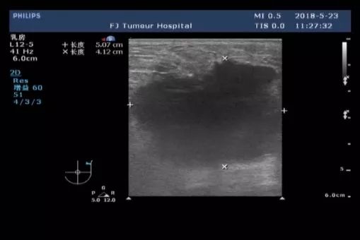 ▎疗效评估: B超(2018-04):左乳外上象限探及一低回声区,大小约4.9cm×3.9cm,边缘不规则,可见成角、毛刺,内部回声不均;左腋中下组探及数个低回声,大者约2.5cm×1.6cm,边界尚清,类圆形,皮髓质分界不清,皮质不规则增厚,淋巴结门消失;右乳及右腋窝未见异常。