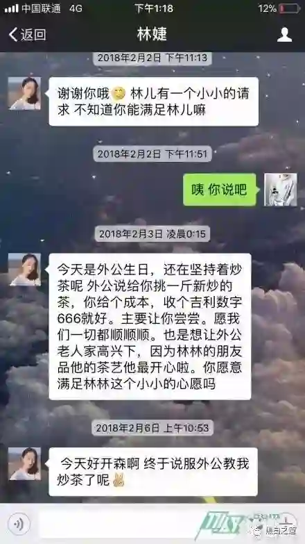 我也遇到过啊!差不多一毛一样!说以为我是她大学同学,聊了一个多月吧,然后她辞职回老家,外公外婆也是在武夷山,然后跟外公学做茶,然后有一天问我喜不喜欢喝茶,可以给我寄一点,我说这么好啊,就把地址给她,然后她居然说要六百多,我就说不是送给我尝尝么,后来就没有要了…现在都这套路了吗