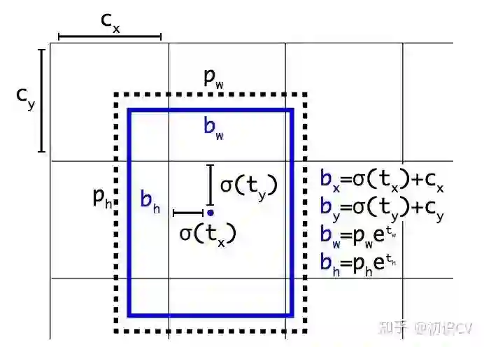 其中, 是预测边框的中心和宽高。 是预测边框的置信度,YOLO1是直接预测置信度的值,这里对预测参数 进行σ变换后作为置信度的值。 是当前网格左上角到图像左上角的距离,要先将网格大小归一化,即令一个网格的宽=1,高=1。 是先验框的宽和高。σ是sigmoid函数。 是要学习的参数,分别用于预测边框的中心和宽高,以及置信度。