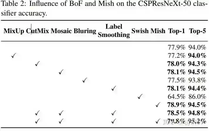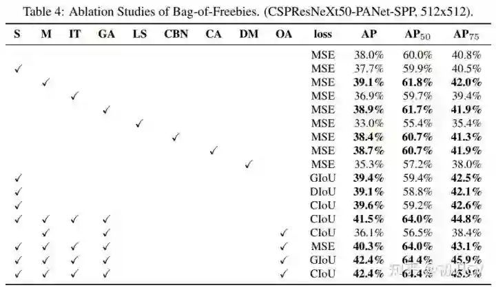 2. 在检测器训练期间,验证了SOTA的Bag-of Freebies 和Bag-of-Specials方法的影响。