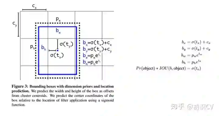 其中, 是预测边框的中心, 是先验框(anchor)的中心点坐标, 是先验框(anchor)的宽和高, 是要学习的参数。注意,YOLO论文中写的是 ,根据Faster RCNN,应该是"+"。
