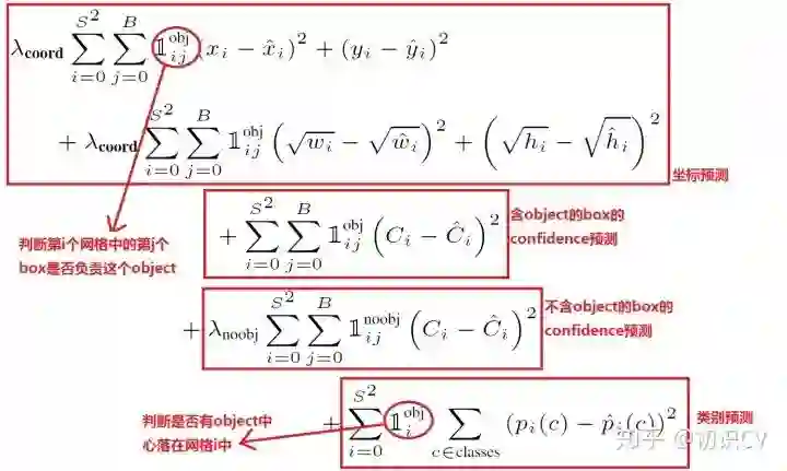其中如果有object落在一个grid cell里,第一项取1,否则取0。第二项是预测的bounding box和实际的groundtruth之间的IoU值。