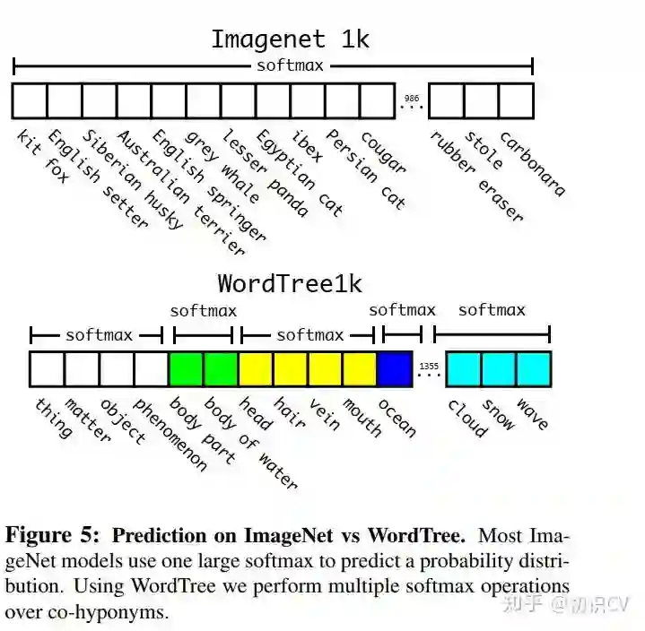 softmax操作也同时应该采用分组操作,下图上半部分为ImageNet对应的原生Softmax,下半部分对应基于WordTree的Softmax: