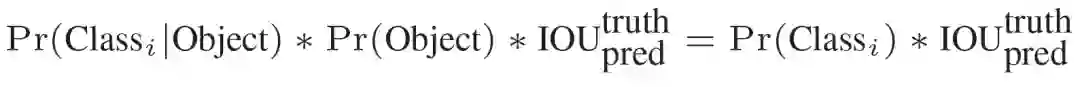 等式左边第一项就是每个网格预测的类别信息,第二三项就是每个bounding box预测的confidence。这个乘积即encode了预测的box属于某一类的概率,也有该box准确度的信息。