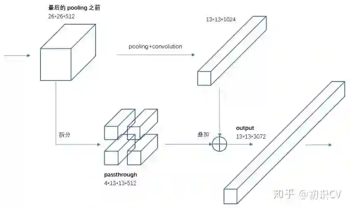 YOLO2引入一种称为passthrough层的方法在特征图中保留一些细节信息。具体来说,就是在最后一个pooling之前,特征图的大小是26*26*512,将其1拆4,直接传递(passthrough)到pooling后(并且又经过一组卷积)的特征图,两者叠加到一起作为输出的特征图。