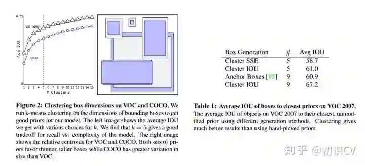 Table1是说明用K-means选择Anchor Boxes时,当Cluster IOU选择值为5时,AVG IOU的值是61,这个值要比不用聚类的方法的60.9要高。选择值为9的时候,AVG IOU更有显著提高。总之就是说明用聚类的方法是有效果的。