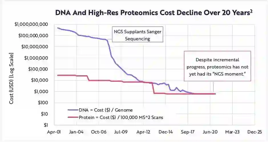 图 | 过去20年基因和蛋白质检测成本的对比(数据来源:Nature Reviews, Chemistry)