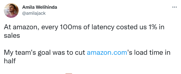 最近,网站开发工程师Amila Welihinda表示,100ms的延迟会让亚马逊网站的销量下跌1%。对此他表示,其团队正在进行开发,目标是将亚马逊网站的加载时间减半。