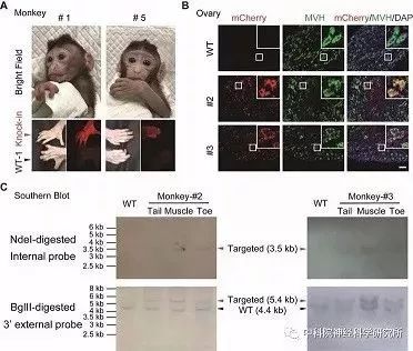基于实验室之前的研究,同源臂介导的末端接合(HMEJ)的方法可以有效地在猕猴胚胎上实现高效的靶向基因整合。研究人员进一步优化受精卵注入条件,包括供体质粒浓度以及注射剂量,期望在提高敲入效率的同时保持正常的胚胎发育,进而获得基因敲入的猴子。具体来说,研究人员在Actb (β-actin) 位点插入p2A-mCherry以实现mCherry在Actb启动子的控制下表达。在经历完整的怀孕周期后,研究人员成功地获得了一对双胞胎猴(#1,雄;#2,雌)和三只单胎的雌性猴 (#3、#4和#5)。通过直接表皮荧光观察两只新生猴(#1,#5)的脚趾发现,与野生型相比,#1和#5展现出mCherry荧光。对两只死亡雌猴子(#2,#3)的各个组织进行切片观察,发现尾巴、脚趾、心脏、肌肉、心脏、肾、大脑和卵巢均显示出不同嵌合程度的mCherry表达。值得注意的是,研究人员在卵巢的大部分区域都检测到mCherry的表达,说明基因敲入猴子具有生殖系传递的可能性。所有组织的PCR鉴定测序结果都表明在5’和3’连接处的整合是正确的。此外,Southern印迹分析进一步证实# 2和# 3猴的基因整合是正确的且没有额外的基因随机整合。