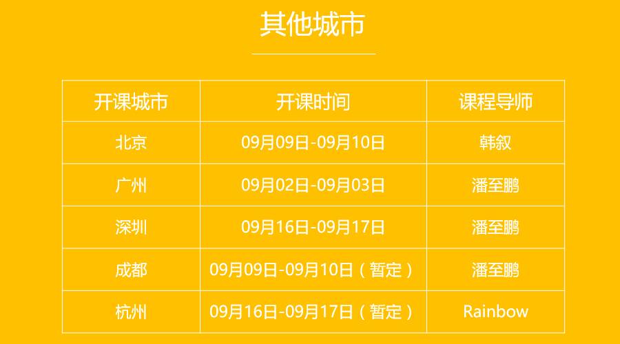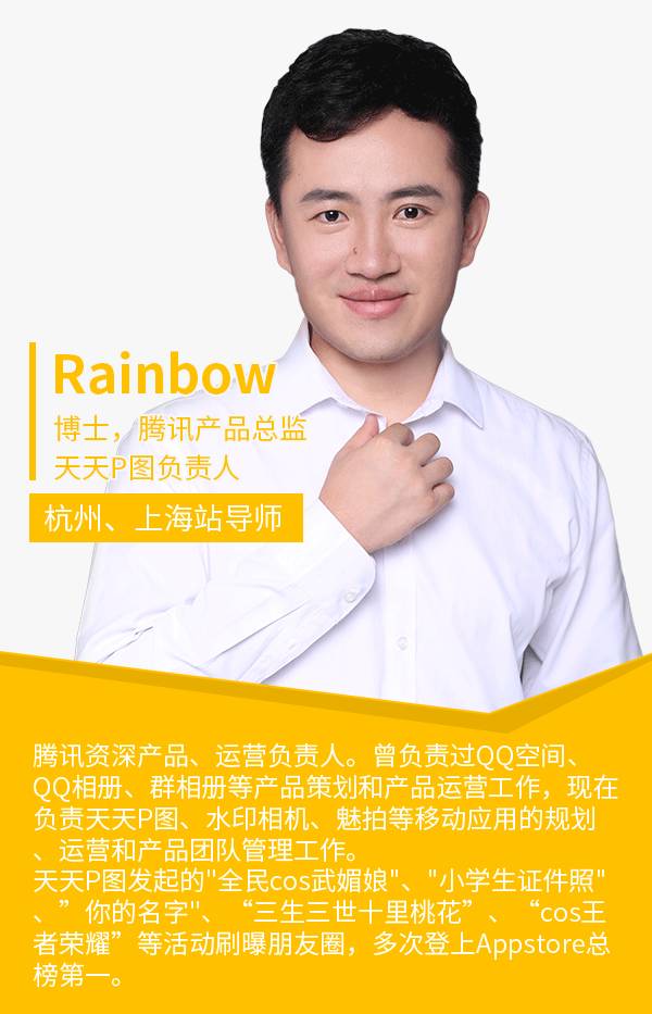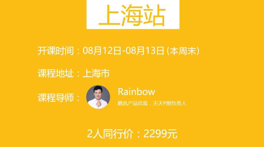 本周末(8月12日)上海站,最后几天,起点学院邀请天天P图负责人,腾讯产品总监,腾讯学院认证讲师Rainbow老师,采用案例式教学+实战模拟的授课模式,系统讲解互联网运营思维、用户运营、活动运营、渠道运营、数据运营的种种。让老司机帮你构建系统的知识体系,玩转运营套路,让工作更加得心应手!