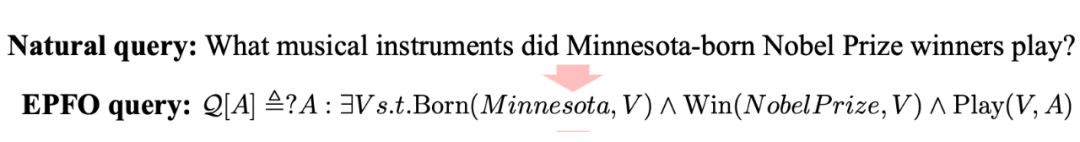 本文主要解决的问题是复杂逻辑查询,包括:补充边(imputed edges)、多源的实体、Existential Positive First-Order(EPFO)逻辑,以及未知的中间实体等。下面是 EPFO 的一个示例: