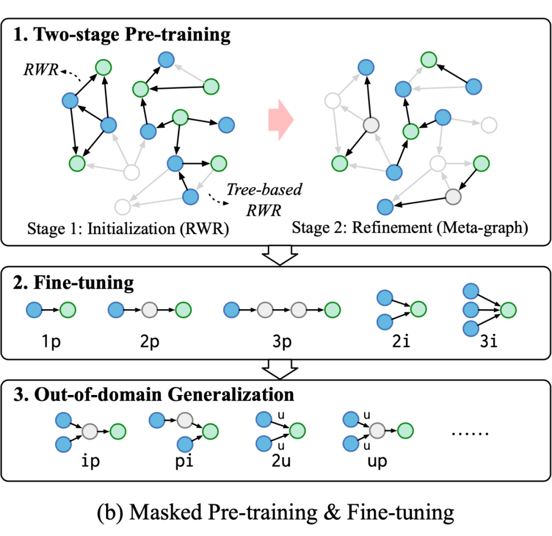 在定义 kgTransformer 的结构与输入数据模式之后,开始进行模型的预训练与微调。作者又把预训练分为了两个阶段,在第一个阶段,使用随机游走采样出不同的子图,进行模型的初始化;在第二个阶段,使用预先定义好的一些 meta-graph 结构继续预训练。