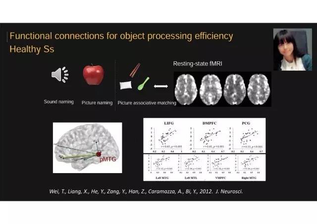 我们发现这种物体识别理解能力,与额叶和顶叶一些视觉和语义相关皮层之间静息状态(休息、不做特定任务)下功能连接的强度有关系。一个人这些在静息态脑功能连接强度可以某种程度上预测他/她在物体加工能力的强弱。具体来说,比如我们看这个后侧的颞叶脑区和额叶在静息状态下功能同步性的强弱,强度越高可能这个人在加工物体的时候速度就越快。