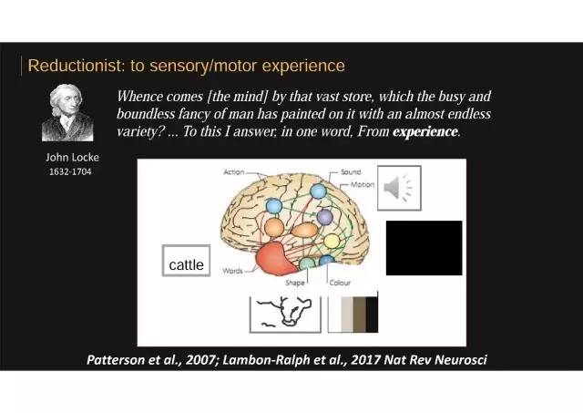 关于知识表征有很多不同的哲学思潮。比如哲学家洛克,几百年前关于如何实现“busy and boundless fancy of man”-大脑中如何有这么丰富的信息--“To this I answer, in one word ,from experience”。提出这些知识来自于我们实际的经验,我们看它的经验,去摸它的经验,感受它的经验。