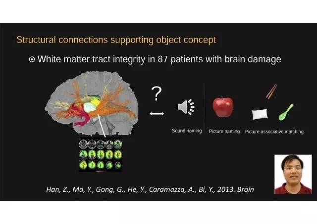 第一个是我和韩在柱教授之前的一个合作,通过研究脑损伤病人看哪些大脑结构连接对物体的识别和理解更为重要。脑损伤病人研究大脑功能非常直接强大的研究手段,因为可以看到不同脑结构被破坏对认知行为的影响。我们与中国康复研究中心合作收了近一百个病人,分析了87个病人中大脑主要白质纤维束损伤情况与物体识别和理解障碍的关系。白质纤维束是神经传导的重要结构,是由大量大轴突形成的束(bundle)。
