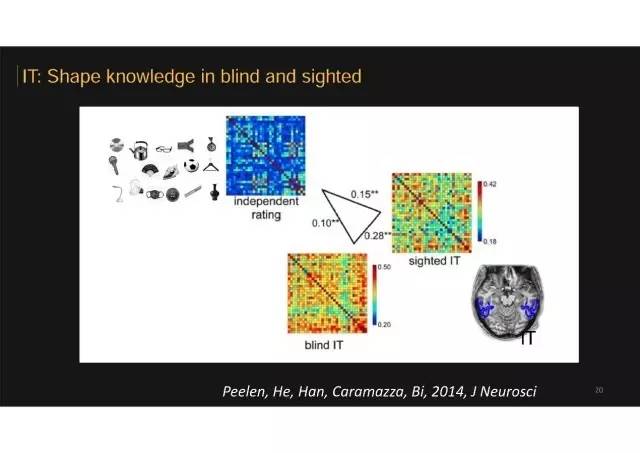 同样的方法我们也可以应用到大脑数据分析上。右边红色矩阵反映出来33个物体每两个之间在腹侧颞叶皮层(inferior temporal)反应模式的相似性,构建出一个33x33的矩阵,这就是神经反应模式空间。每个物体的神经活动模式我们是通过把颞枕皮层(右下角)所有体素的激活强度分布特点来计算的。我们把大脑高级视觉皮层的物体神经反应模式矩阵,与行为上的特定特征矩阵做相关,就可以推测这个脑区神经活动表征这种特征的程度。这种分析方法叫神经表征形似性分析方法,可以用来推测大脑所表征的信息内容。这个分析结果是先天盲人和普通人腹侧颞枕皮层的神经活动模式矩阵与物体形状矩阵都有显著相关。