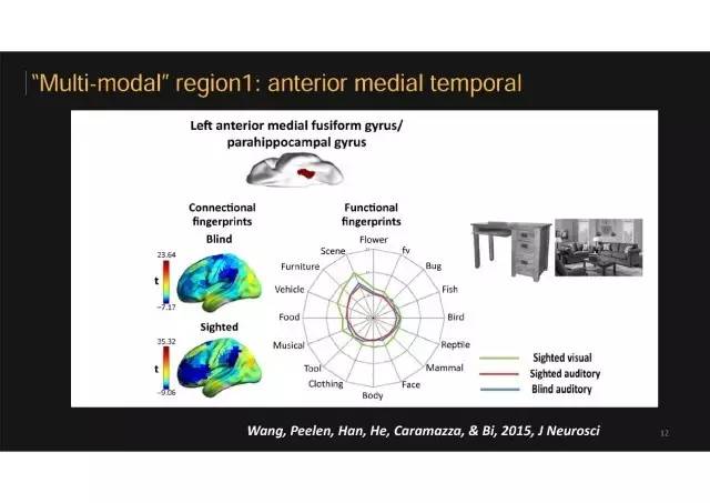 盲人和正常人实验中,这个脑区都喜欢这几类物体——场景、家具、大的东西,还有交通工具。这个脑区与其他脑区连接模式在不同人群中也非常相似,都与一些参与空间导航的脑区连接更强。