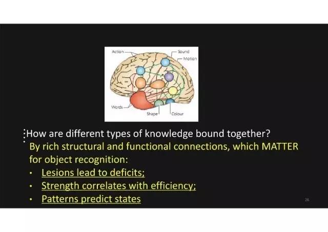 关于简单的物体,它不同方面的知识,需要多个不同脑区共同参与,它是如何组合在一起来表示同一个物体的。而这种组合方式在识别物体过程中有什么样的影响。