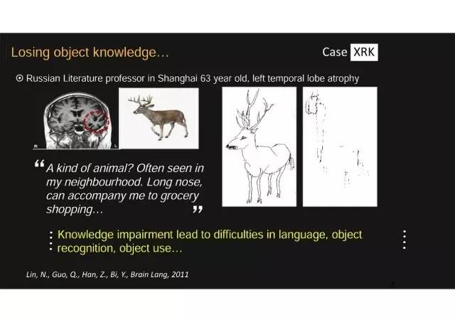 首先跟大家介绍个我们和华山医院郭起浩医生合作过的病人案例:这个病人原来是大学俄语系教授,后来下海经商,人非常聪明。他太太带他过来看病,说这个人有些糊涂。表现是:让他买苹果,他买回来香蕉;让他买茄子,他买回来西红柿。我们给他做了神经心理测查:给他看鹿的图片问他这是什么?他说:“这是一个动物吧,我们家附近老有,经常陪我买菜。” 他们家住在上海静安区,绝对没有这种动物陪他逛街。左图是他照着画的图,右边是给他名字让他凭记忆画的图。他记忆中动物的样子都是一个脑袋、四条腿、一条尾巴。