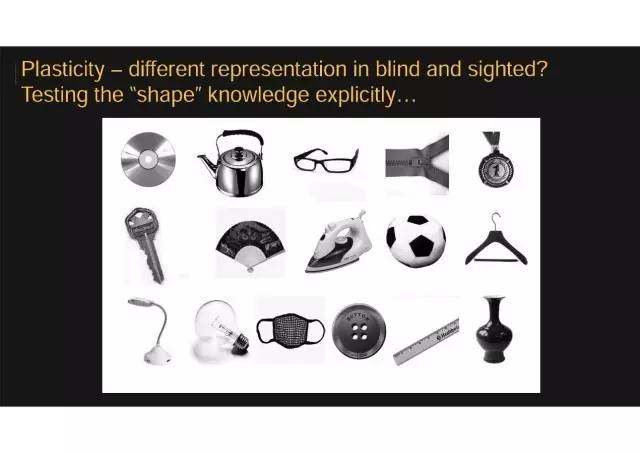 我们以特殊群体作为研究对象有一个经典问题:虽然发现了对于这种人造物先天盲人和正常人的反应是相似的,但是怎么知道它是因为同样的原因相似呢?会不会可能在盲人大脑里它有其他特点,但表现出同样的测试结果?所以我们在另外一个研究中更直接检验是否在两种人群种是在处理同样的信息表征。我们找了一些很常见的人造物材料,是盲人和正常人都比较熟悉的,然后专门去看相关脑区是对这些物体那些方面进行加工。