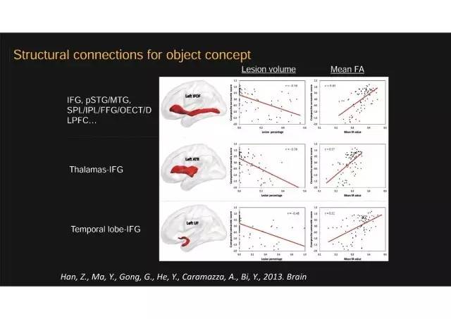 我们把脑与认知行为数据做相关,发现了三个主要白质纤维束上有显著相关,也就是说这三条纤维束的完好对这种物体识别和理解不可或缺。上面这个我们叫下额枕束,散点图里每个点是一个病人,在这个白质束上损伤更严重,物体识别和理解障碍也越严重,比如看到苹果的图片可能会说叫桔子或者香蕉。下面这两条白质束也是相似的模式。这些结果说明物体识别和理解依赖于远程脑区之间的结构连接。