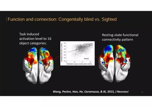 而往前的部分是盲人和正常人比较一致,相对独立于视觉经验的影响。