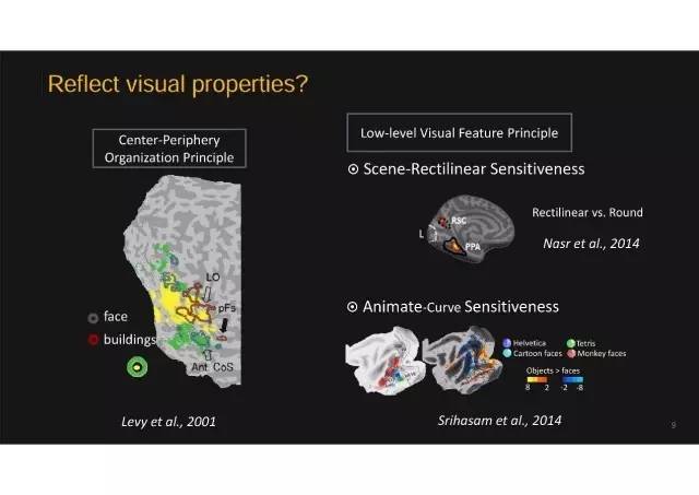 比如2014年Livingstone组的一篇文章通过灵长类动物皮层单细胞电信号记录发现,学习新的视觉符号如果含有弯曲线条会引起特定脑区神经元放电,可能解释对动物类型的喜好。这些理论假设的共性就是不同物体类别的脑区分布基础是由于不同视觉特征所引起的。