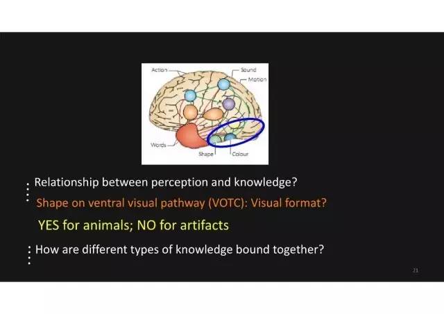 我通过跟大家分享了两个先天盲人的实验,对刚才第一个问题进行回答:人对物体长什么样子的知识与实际视觉识别它的经验之间关系是非常复杂的,不是简单的是或者不是的答案,而是受到了不同物体类别的影响。对动物识别脑区来说是非常依赖视觉,但是对于许多其他类型物体,特别是人造物,识别脑区并不依赖于视觉经验。