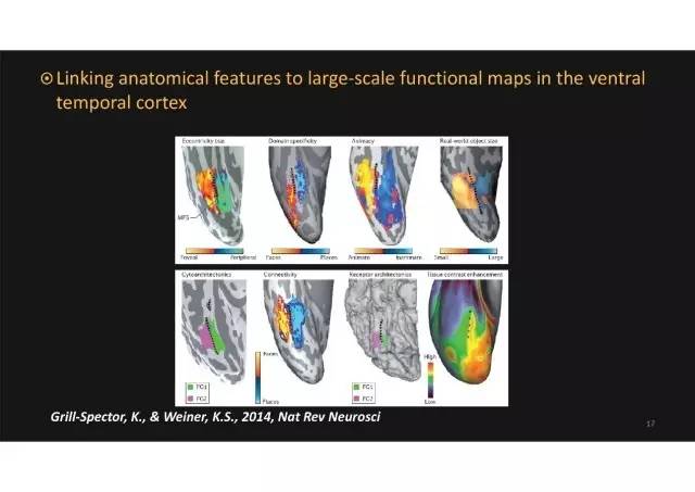 从大脑本身解剖特点来看,我们看下梭状回(Fusiform gyrus)这个物体识别的重要脑区。这个脑区以一个沟分成内侧和外侧。如刚才所介绍,已经非常多的研究发现,功能上内外侧有区别--外侧喜欢动物类,内侧是喜欢人造物和场景。同时,这两部分细胞的种类、构筑方式、连接模式都有区别。可能我们把不同物体放在这两类不同区域去处理,是因为他们不同类型的神经元适合处理不同的信息。也有可能反过来我们因为进化的需要发展出来这种不同的视觉子系统,专门去处理需要我们有不同反应的物体。
