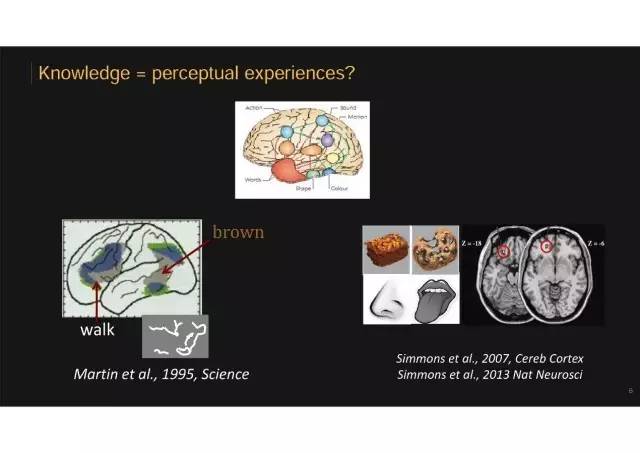 这种经验主义理论把一个基本物体的知识,比如关于它视觉的知识,它长什么样子,它有什么颜色,它会发出什么样的动作,就来源于我们以前不断看它的经验,而相应存储在视觉皮层相关感知觉经验模式区域。而它会发出什么样的声音的知识来源于我们以前听它的经验。