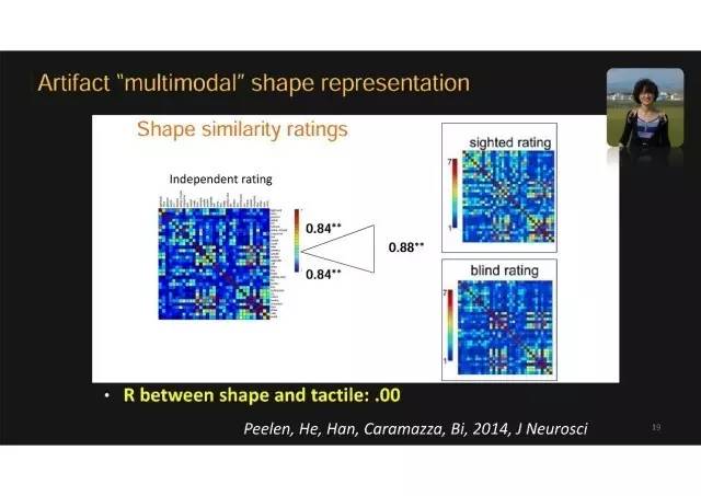 我们第一个有趣结果就是这两个空间是非常相似的。也就是说先天盲人虽然从来没有看到过这个东西,但是通过触摸或者其他渠道学习,对这个东西长什么样子的感觉跟大家是一样的。