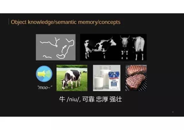 对于左上这个图形,投射到我们视网膜上仅仅是特别简单的线条、明暗的对比,但我们知道这个东西背后长什么样子,它会发出什么样的声音,它在什么地方出现,对我们人有什么功能,还有特定的人会给它的标签,抽象的特征比如说它很可靠,很忠厚,很强壮等等。我们大脑是如何存储这些知识,而这些知识的存储是如何影响我们去识别物体呢?