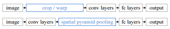所以当全连接层面对各种尺寸的输入数据时,就需要对输入数据进行crop(crop就是从一个大图扣出网络输入大小的patch,比如227×227),或warp(把一个bounding box的内容resize成227×227)等一系列操作以统一图片的尺寸大小,比如224*224(ImageNet)、32*32(LenNet)、96*96等。所以才如你在上文中看到的,在R-CNN中,“因为取出的区域大小各自不同,所以需要将每个Region Proposal缩放(warp)成统一的227x227的大小并输入到CNN”。 但warp/crop这种预处理,导致的问题就是在一定程度上会造成数据的丢失或几何的失真,限制了识别精确度。没太明白?说句人话就是,一张16:9比例的图片你硬是要Resize成1:1的图片,你说图片失真不? SPP Net的作者Kaiming He等人逆向思考,既然由于全连接FC层的存在,普通的CNN需要通过固定输入图片的大小来使得全连接层的输入固定。那借鉴卷积层可以适应任何尺寸,为何不能在卷积层的最后加入某种结构,使得后面全连接层得到的输入变成固定的呢? 这个“化腐朽为神奇”的结构就是spatial pyramid pooling layer。下图便是R-CNN和SPP Net检测流程的比较: