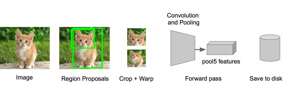 步骤三:特征提取 • 提取图像的所有候选框(选择性搜索selective search) • 对于每一个区域:修正区域大小以适合CNN的输入,做一次前向运算,将第五个池化层的输出(就是对候选框提取到的特征)存到硬盘